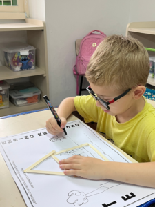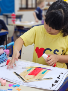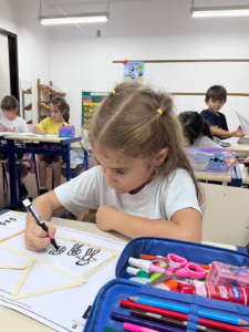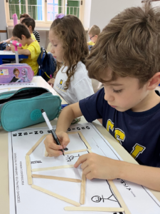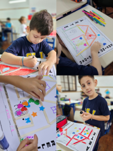 Nesta atividade, os alunos “construíram” suas moradias com palitos de picolé e desenharam seus familiares, representando, de forma simbólica, o valor e o significado do lar.