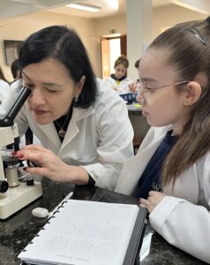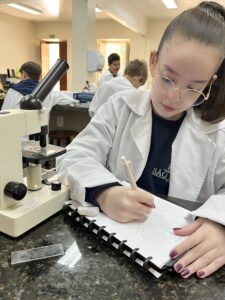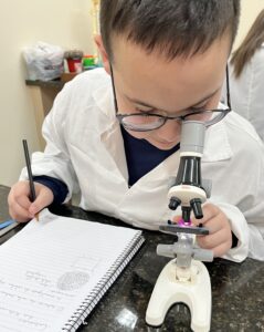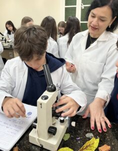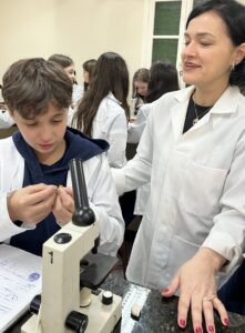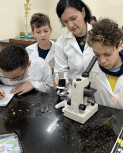 No Laboratório de Ciências, os alunos do 6º ano, orientados pela Professora Vanesca Severo, tiveram contato direto com o estudo das células e o funcionamento do microscópio, instrumento essencial para a ciência. Durante a aula prática, os alunos puderam compreender as partes e funções do microscópio, além de observar lâminas preparadas, explorando assim os fascinantes mundos microscópicos.