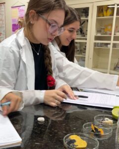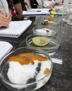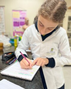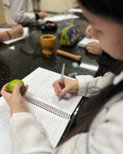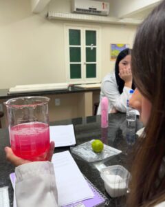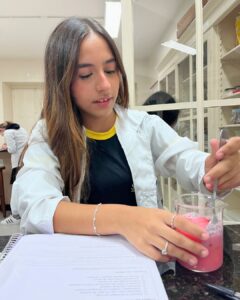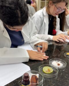 A Professora Vanesca Severo realizou aulas práticas com a 1ª série do Ensino Médio sobre o teste de amido com iodo e a extração de DNA de morangos. Os alunos aprenderam, de forma interativa, sobre a composição química e genética. Observaram o DNA a olho nu e compreenderam sua importância.